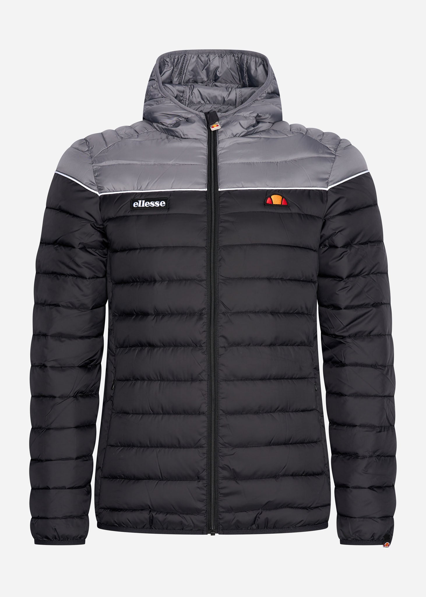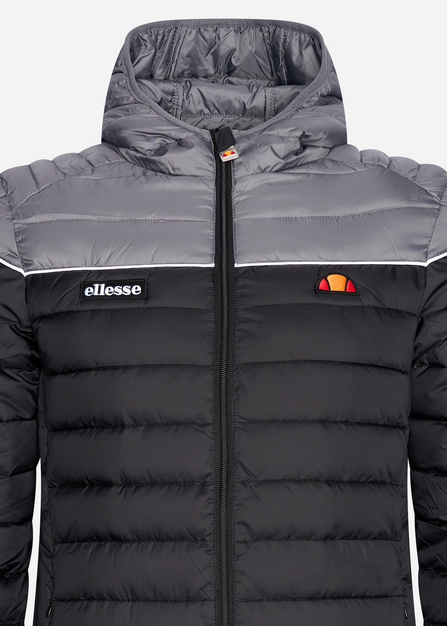 Die Lombardy Jacke von Ellesse ist eine sportliche Steppjacke. Die Jacke hat einen durchgehenden Reißverschluss und eine Kapuze. Auf der Brust ist links und rechts ein Ellesse-Logo abgebildet. Diese Jacke hat eine schwarze und graue Farbe und besteht aus Polyester.